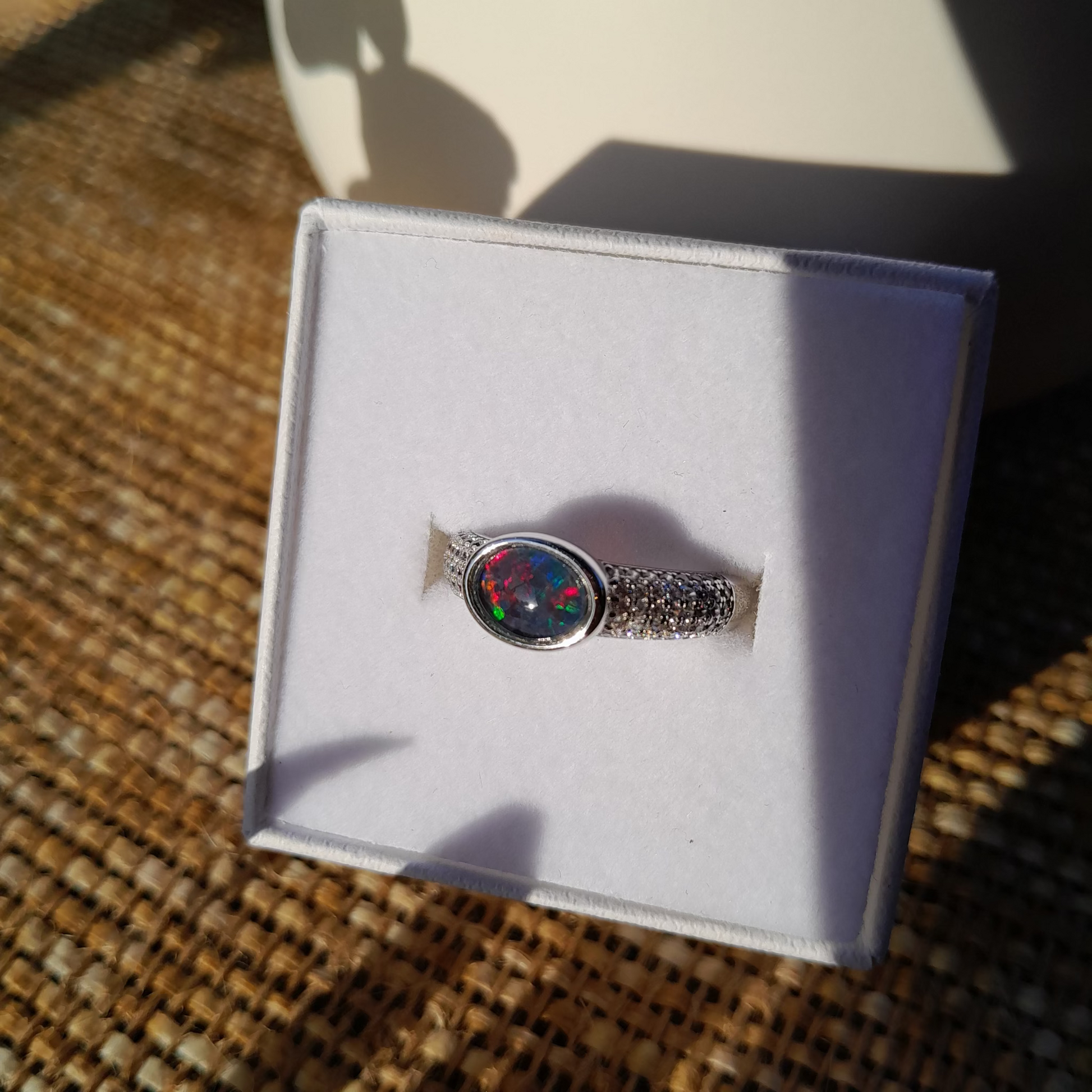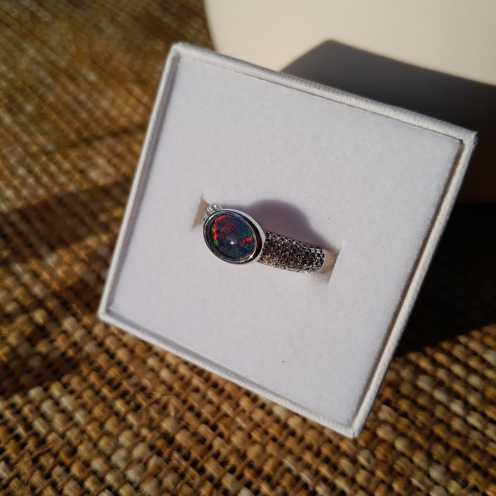 This stunning oval opal gemstone flashes with vibrant reds, blues, and greens — a natural play of colour that changes with every movement. Set in a beautifully detailed band with sparkling accents, it’s a piece designed to draw attention and spark conversation.